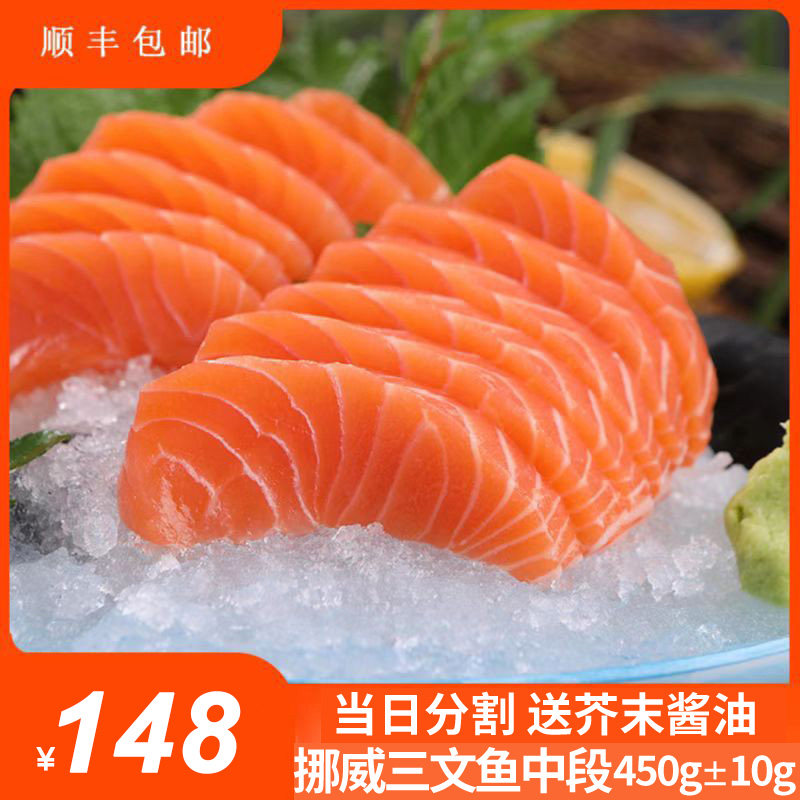 进口挪威冰鲜三文鱼中段刺身大西洋鲑生鱼片送芥末酱油当天现切