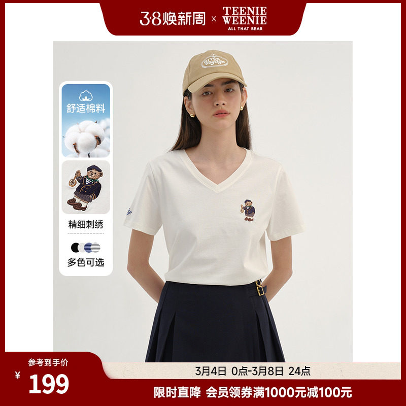 TeenieWeenie小熊2024年棉质V领白色短袖T恤ins风短款宽松上衣女