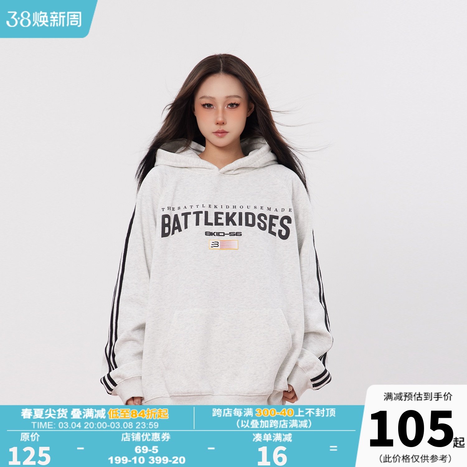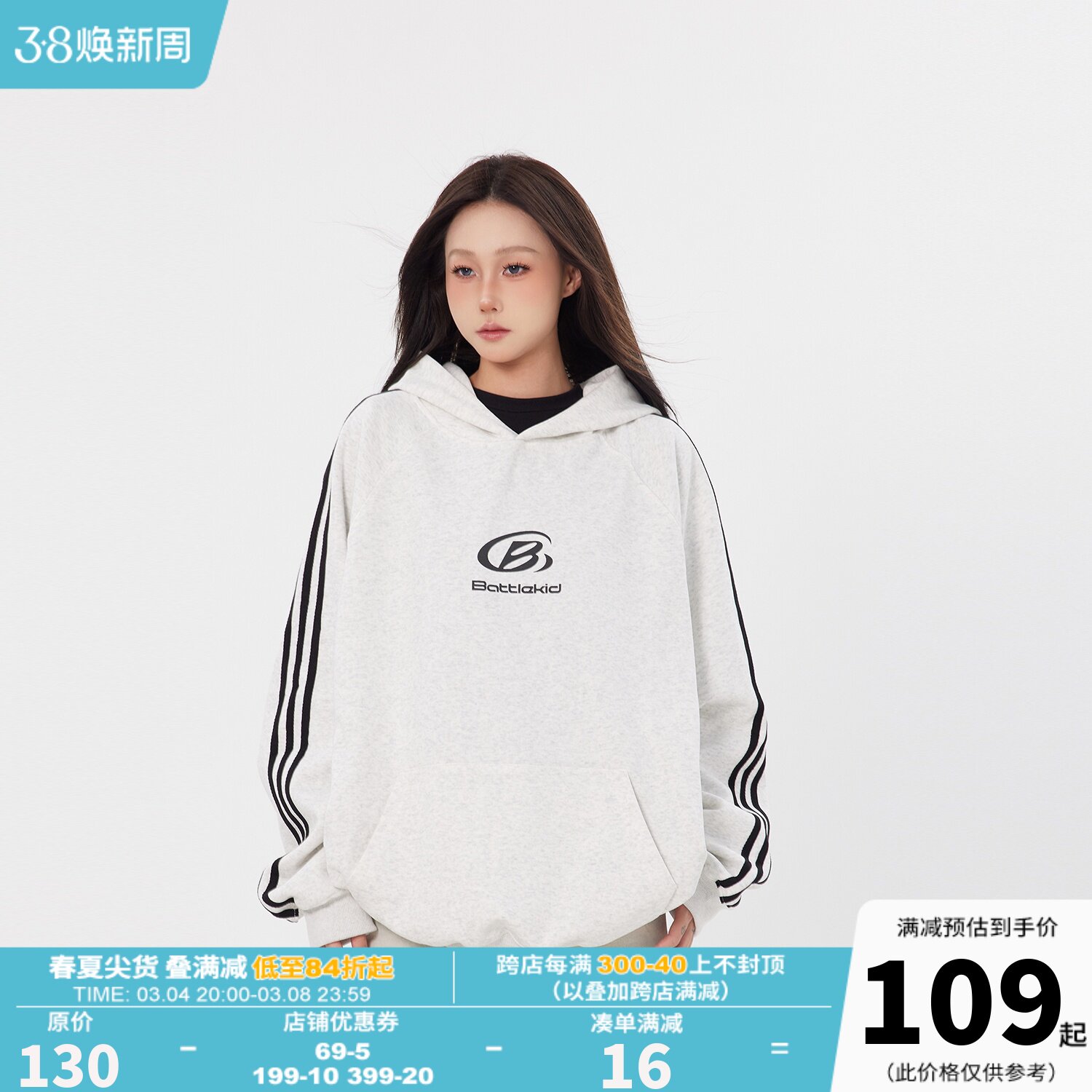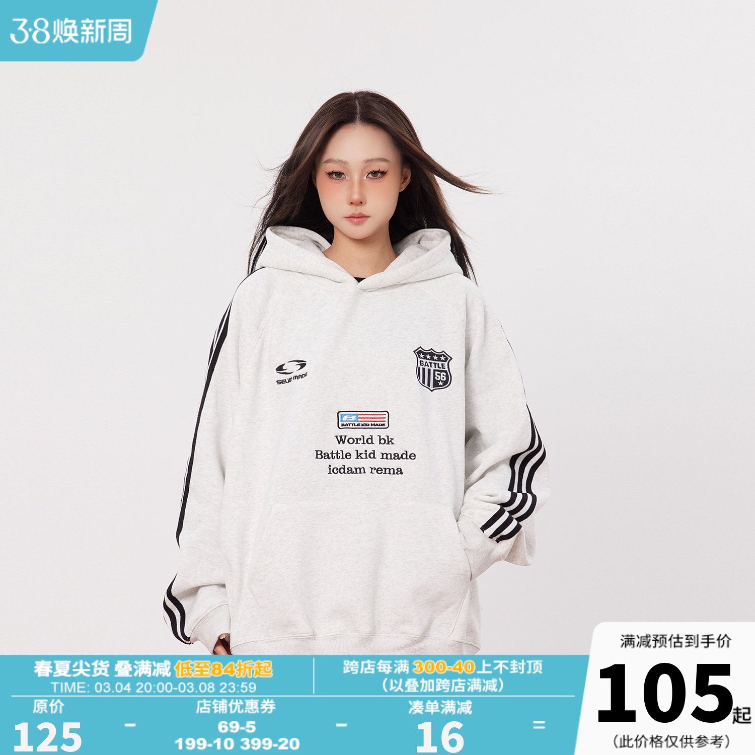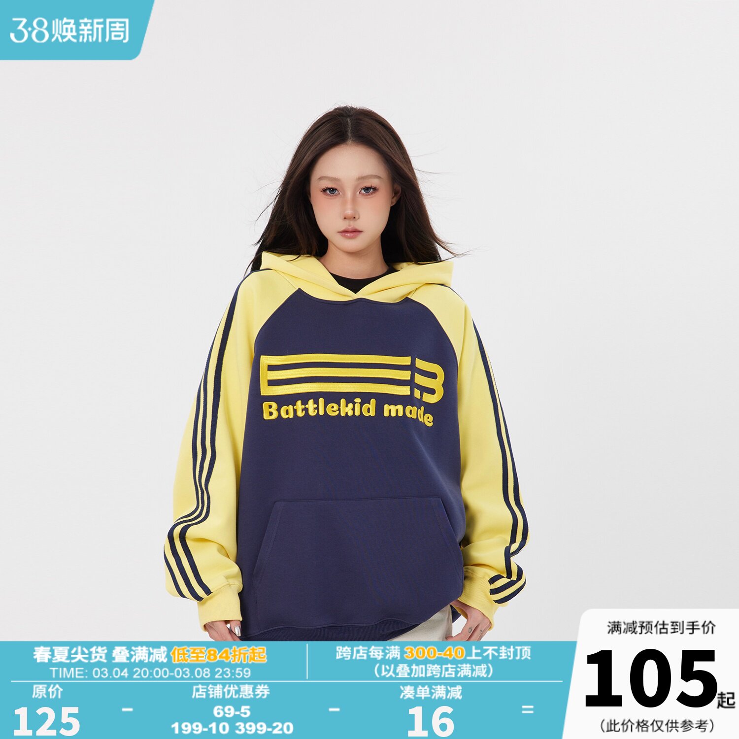 SREK 国潮美式拼色条纹运动连帽卫衣女春季街头宽松情侣帽衫上衣