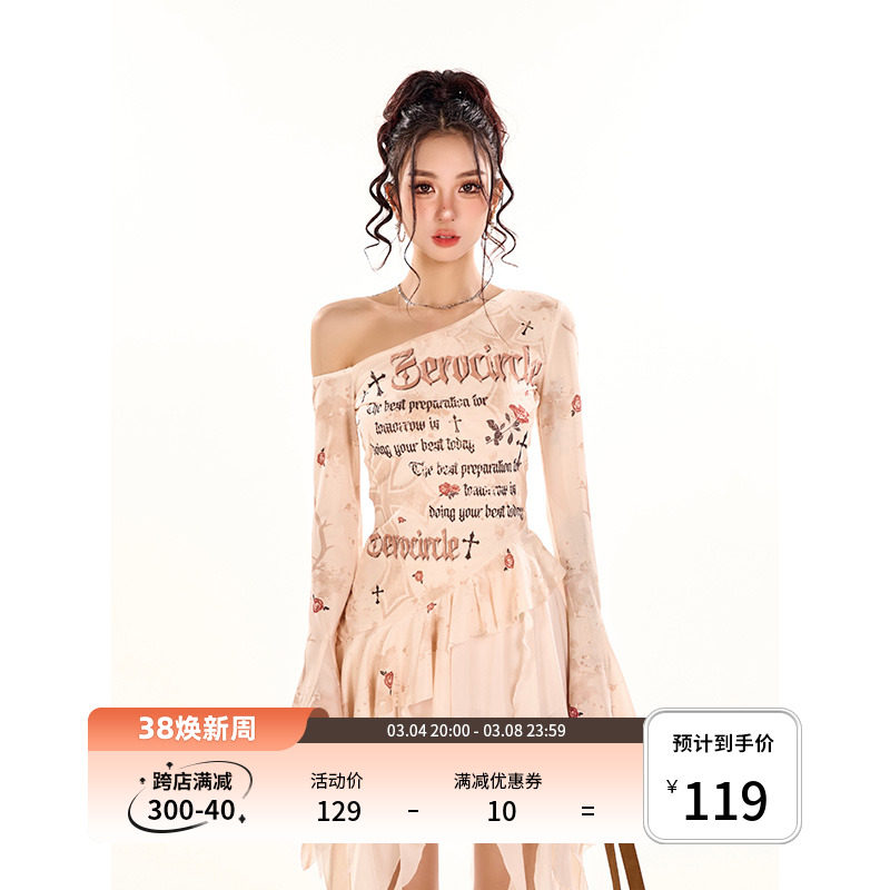 野生zerocircle网纱斜肩上衣女春秋季长袖辣妹性感修身露肩喇叭袖