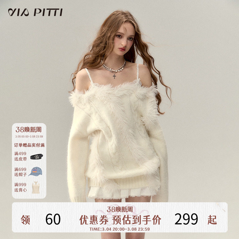 VIAPITTI一字肩设计感羊毛针织衫毛衣女装春季小个子拼接辣妹上衣