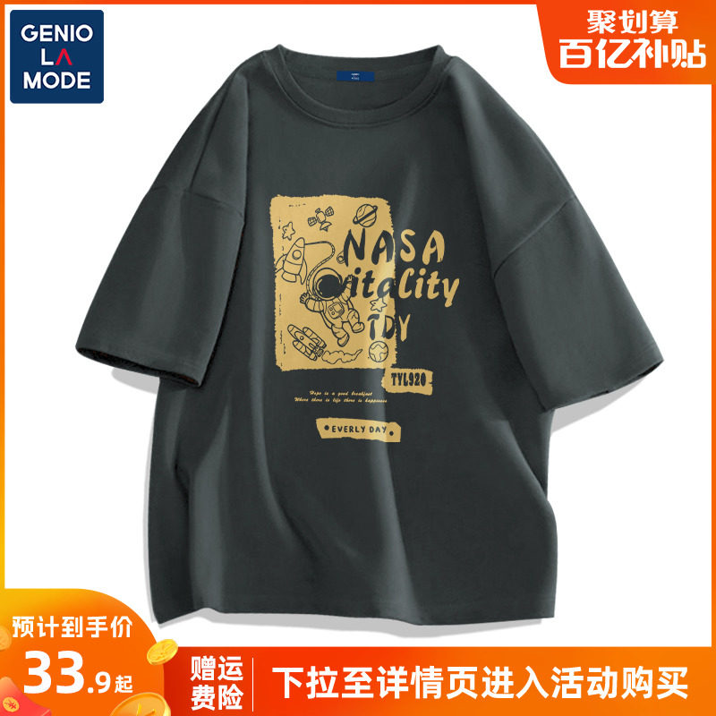 GENIOLAMODE纯棉短袖男t恤2024夏季太空人美式潮牌大码男士上衣薄