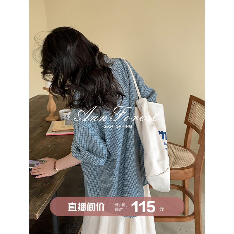 棉质水洗方领格纹衬衫安妮森林2024年春季新款复古亲肤宽松上衣女