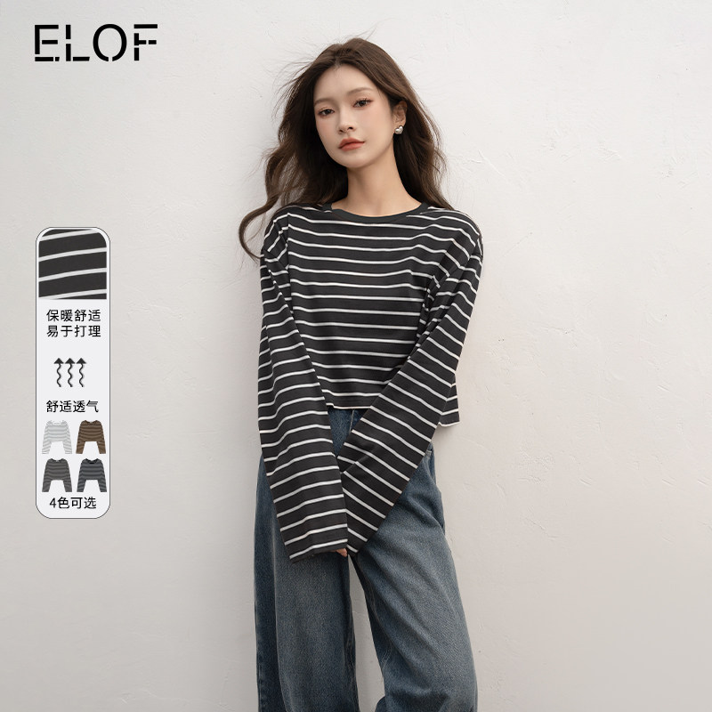 ELOF圆领长袖T恤女2024新款春季条纹打底衫韩版宽松棉质小众上衣