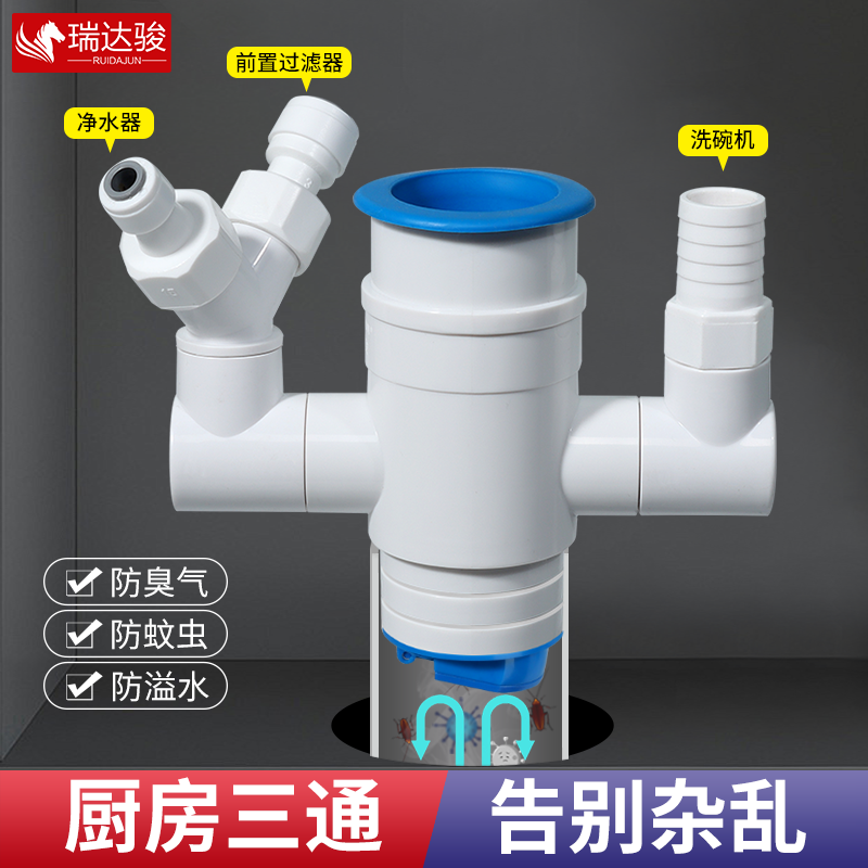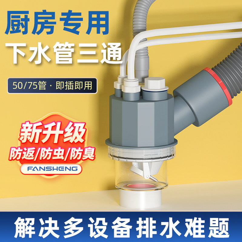 厨房下水管三头通排水道管道防臭三通接头净水分水器防返臭神器50