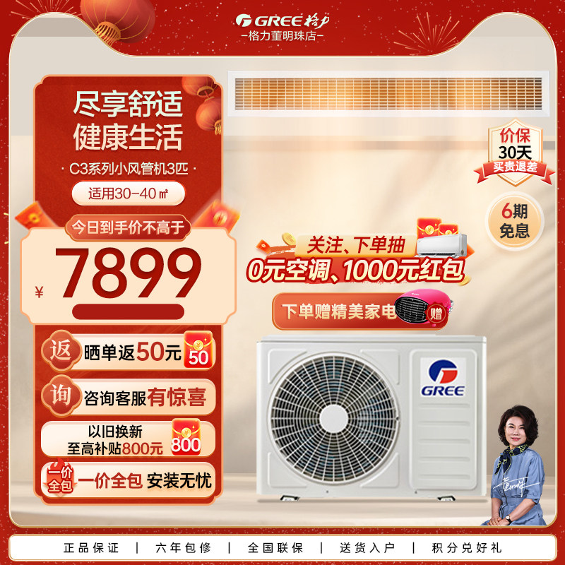 格力客厅中央空调风管机家用卧室一拖一大3匹一级能效变频冷暖C3+