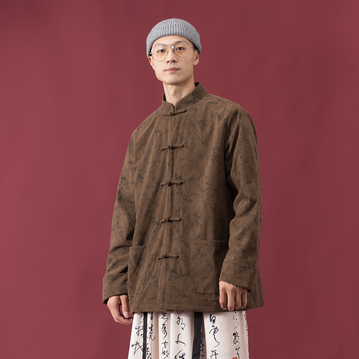 初秋灯芯绒唐装新中式立领盘扣民族复古中国风印花外套中山装夹克