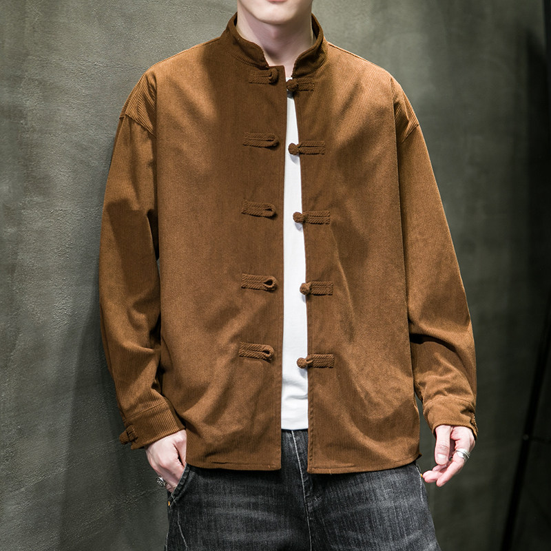中式改良唐装中国风男装灯芯绒长袖衬衫复古茶服大码中山装外套潮