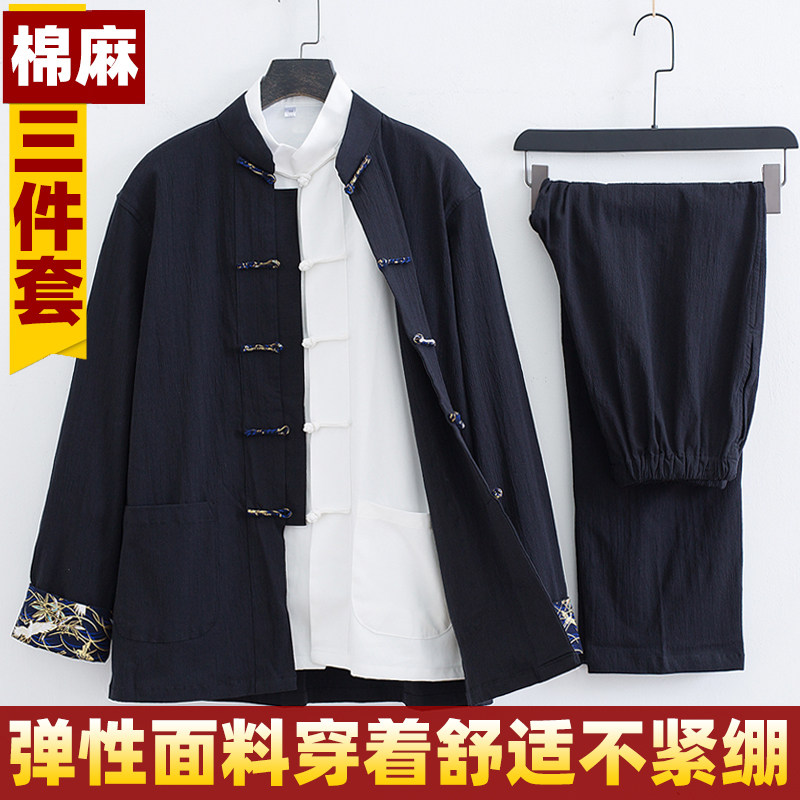 春秋棉麻唐装男士套装中国风三件套中式复古外套中山装汉服居士服