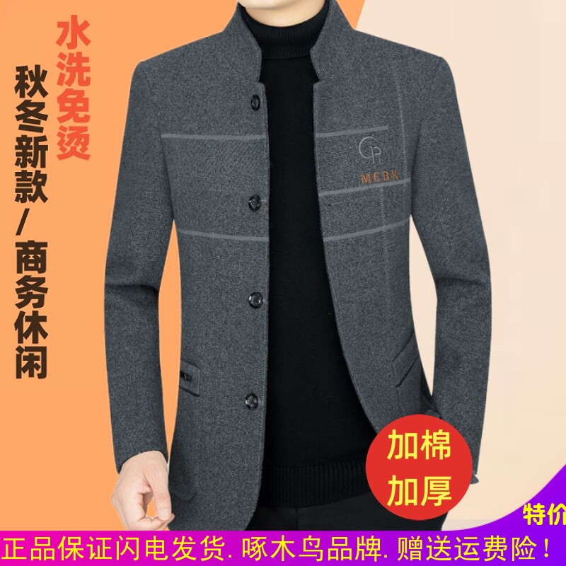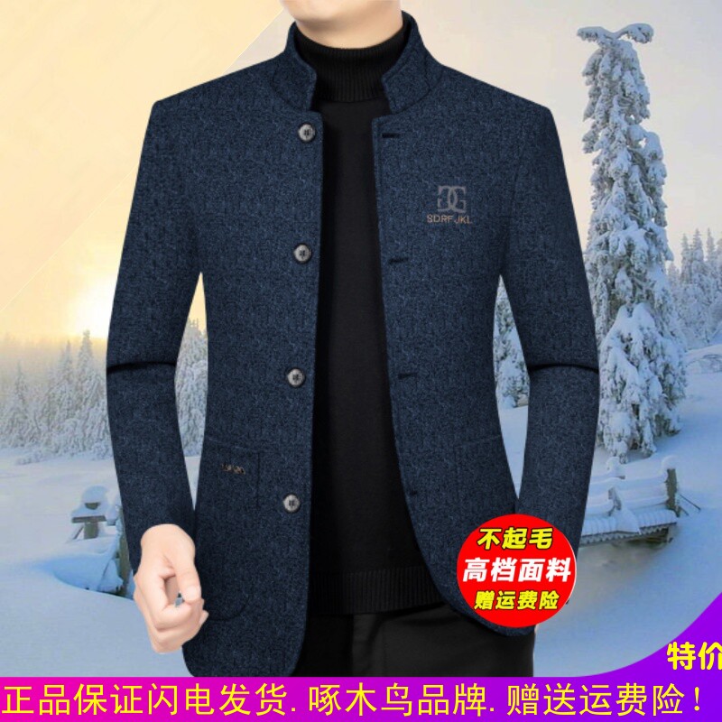 啄木鸟夹克男装中年秋冬季新款男士休闲加绒厚羊毛呢子外套中山装