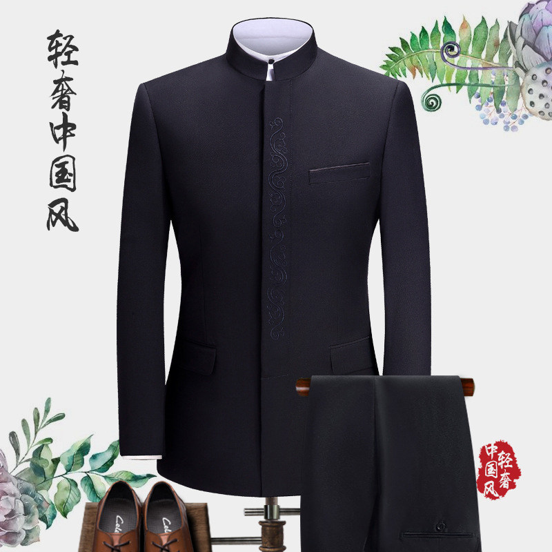 中华立领套装中山装男刺绣祥云喜公公结婚宴会礼服爸爸中山装春秋