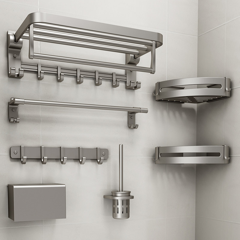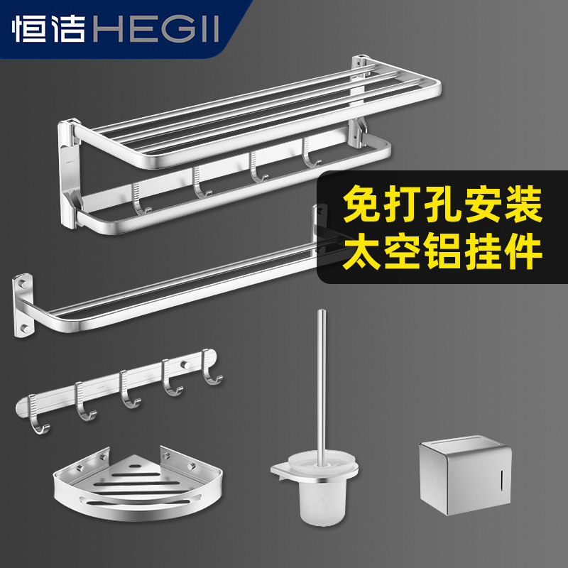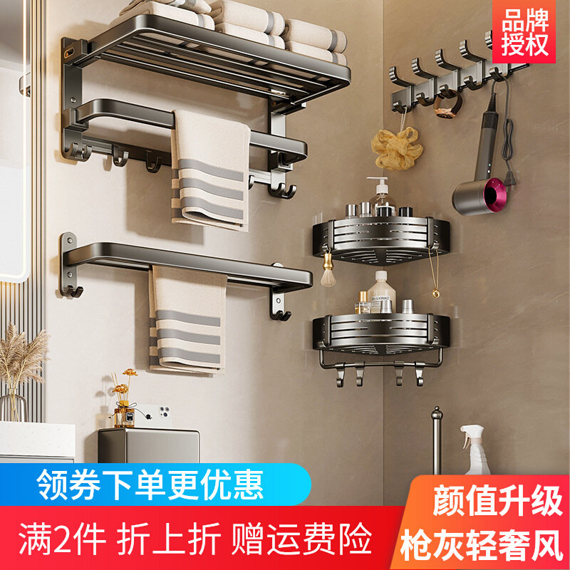 毛巾架免打孔枪灰色卫生间双折叠置物浴室收纳太空铝五金挂件套装