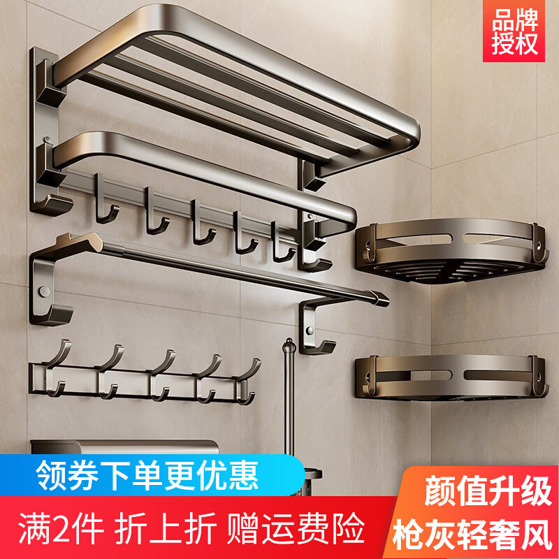 枪灰毛巾架免打孔卫生间墙上壁挂式浴室置物架太空铝五金挂件套装