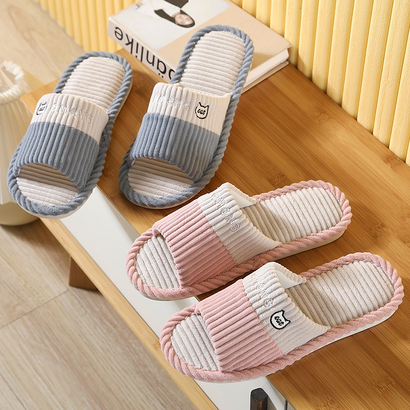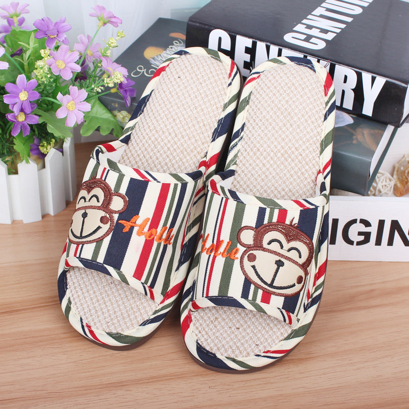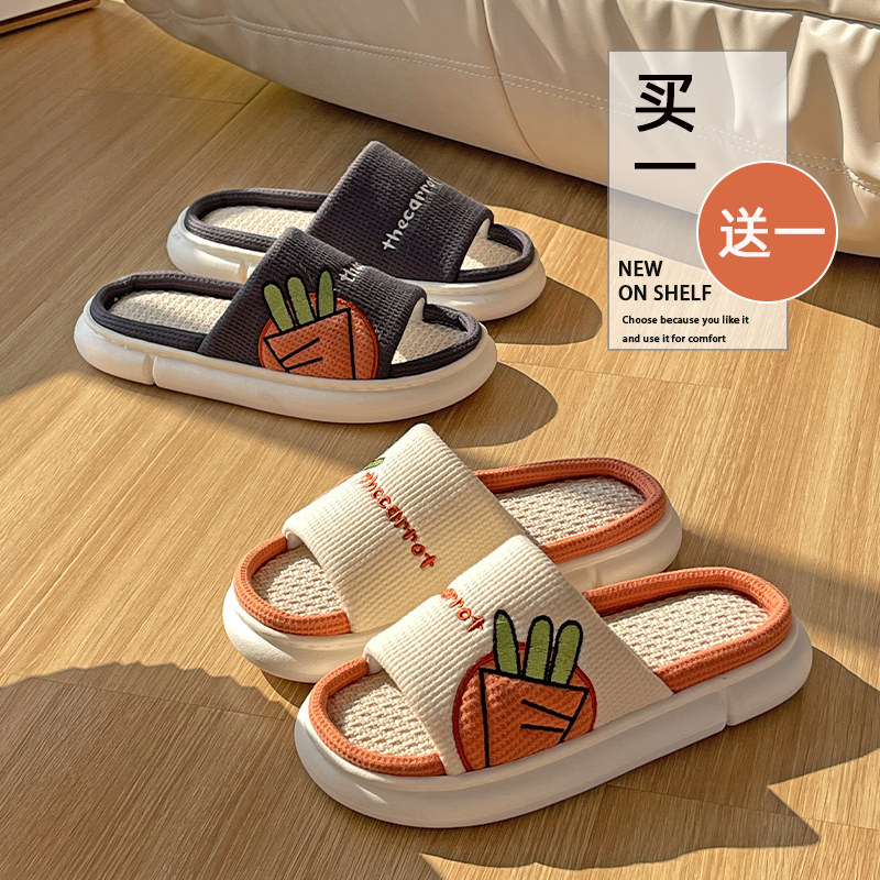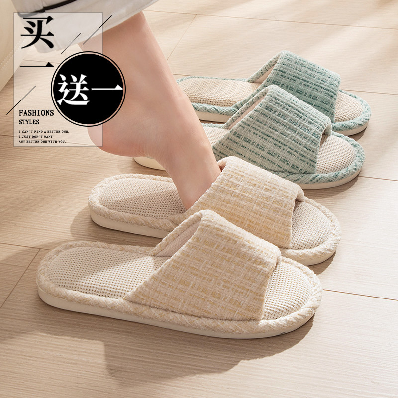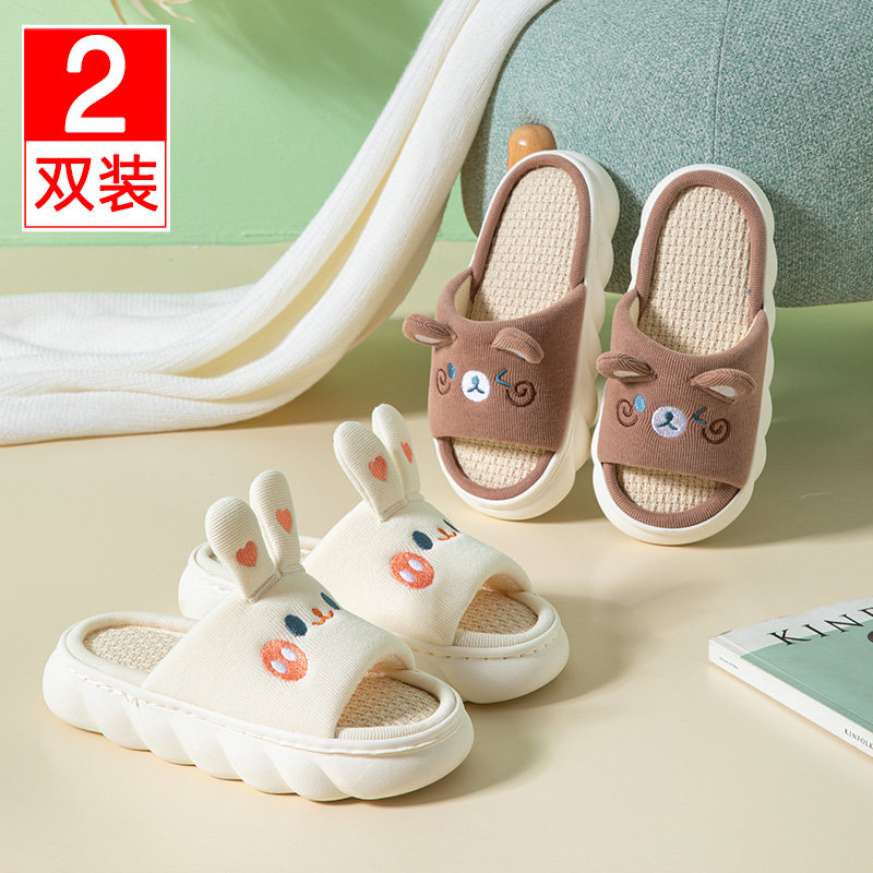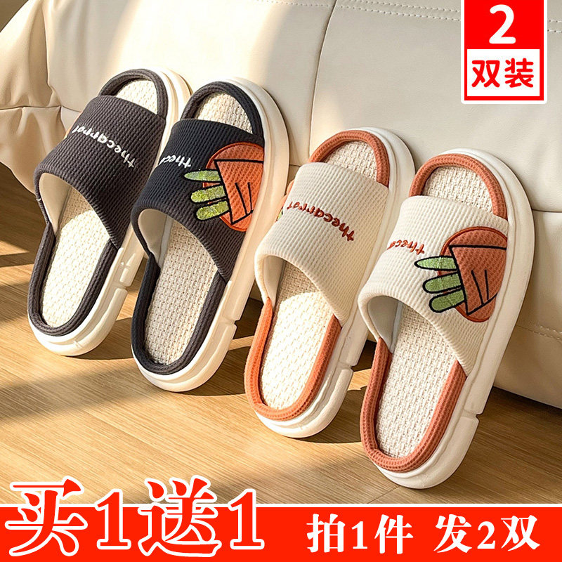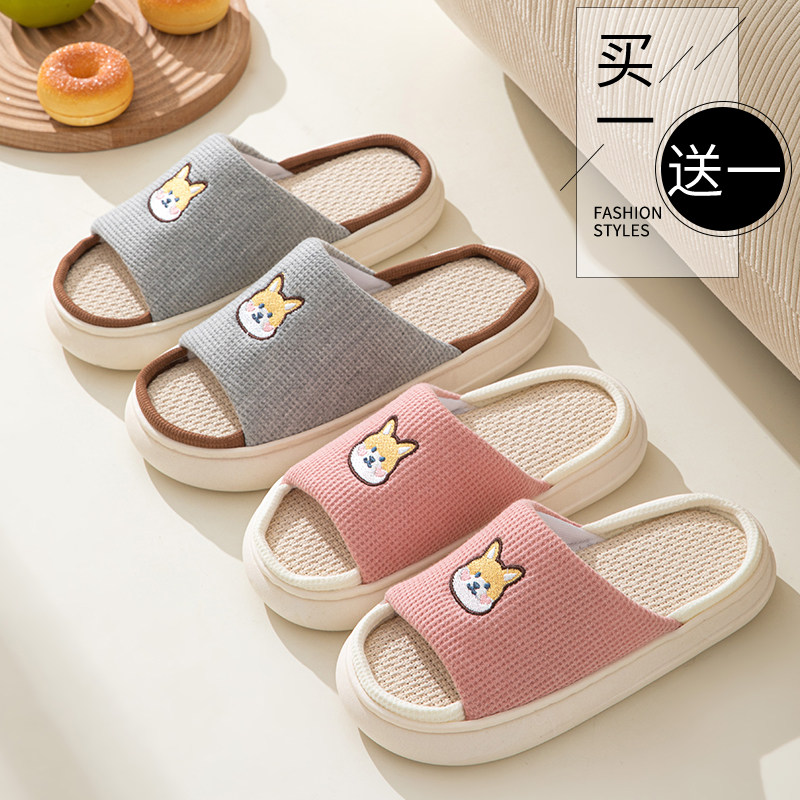 买一送一亚麻拖鞋室内透气防臭居家软底情侣卡通室内防滑拖鞋情侣