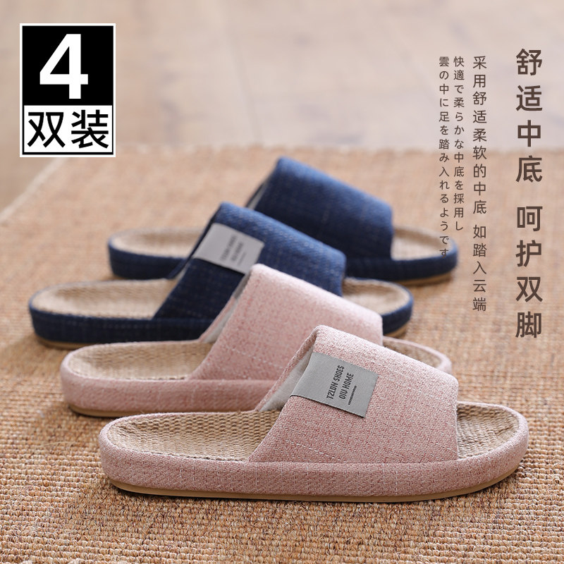 4双装 春秋家居亚麻拖鞋女夏季居家用室内棉麻防滑四季凉拖鞋男士
