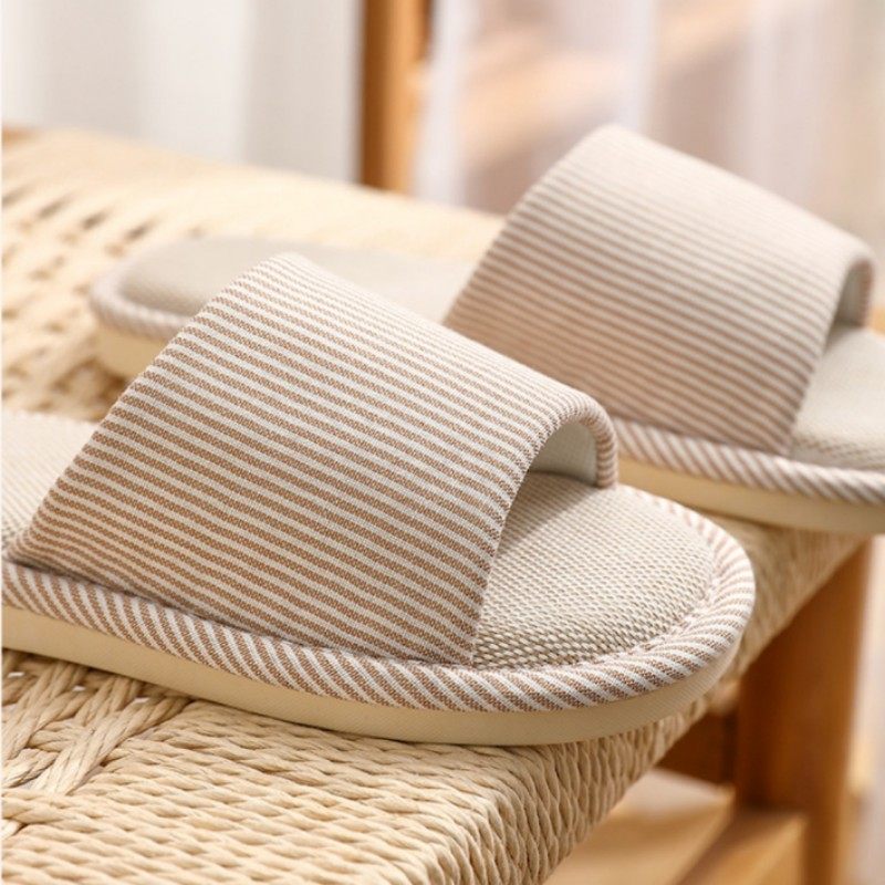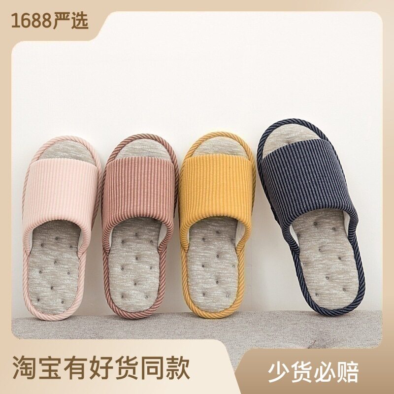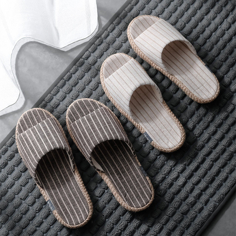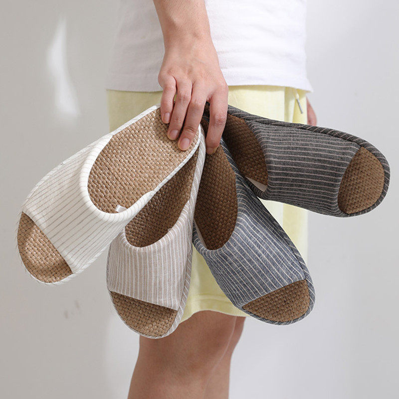 日式淡雅条纹棉麻亚麻情侣家居凉拖鞋男女室内居家防滑软底家用鞋