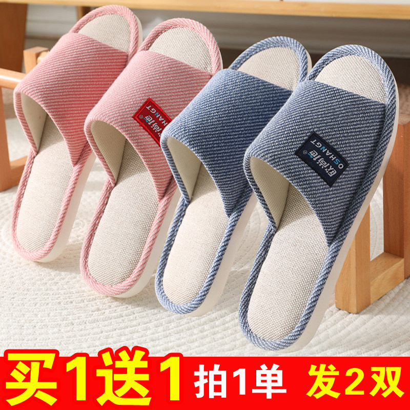 买一送一亚麻拖鞋女春秋季室内家居厚底静音防滑情侣棉麻拖鞋四季