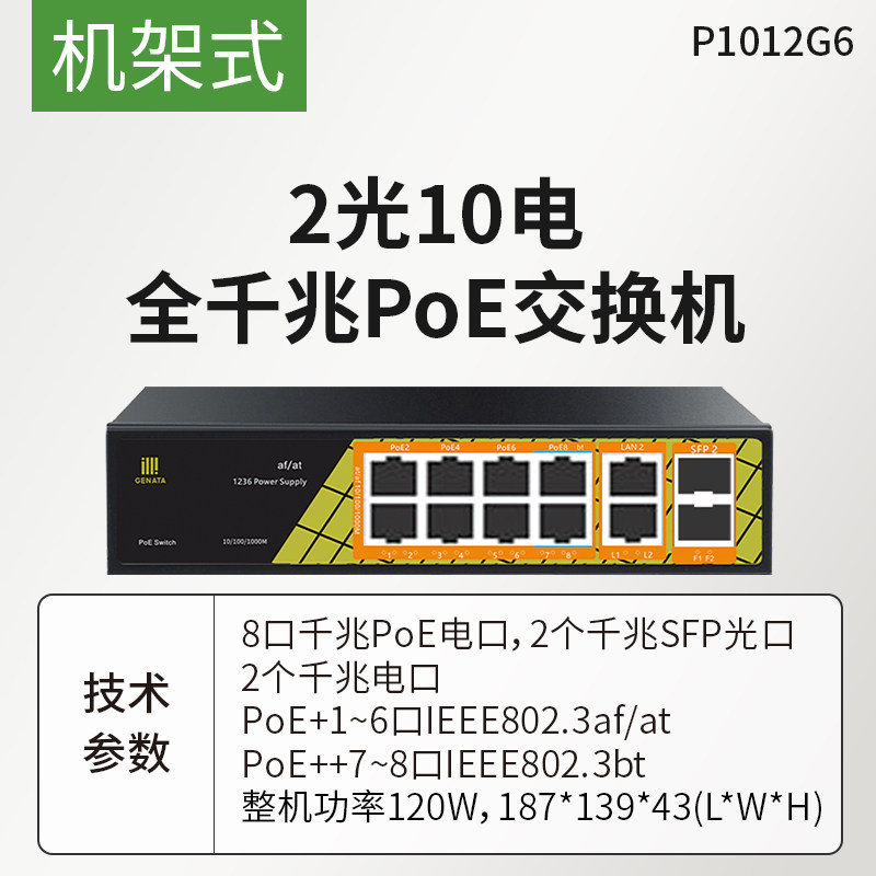 促12口全千兆POE供电交换机2光10电全千兆POE交换机P1012G6