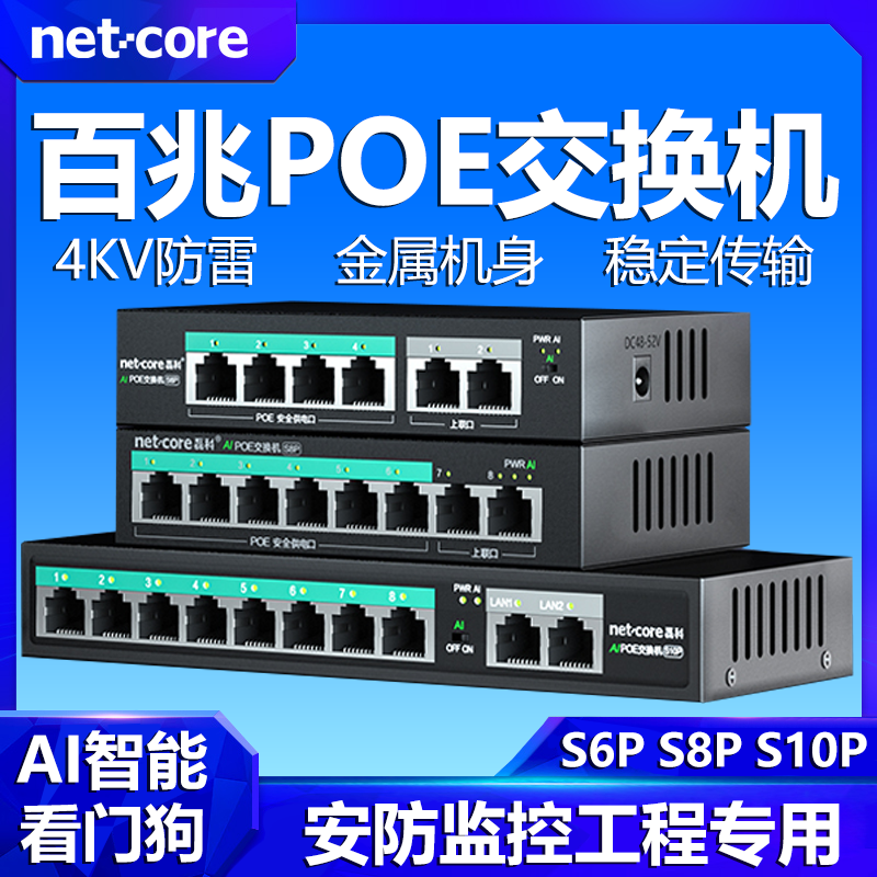 磊科S6P百兆poe交换机6口网络交换器10口分流器8口供电分线器集安防监控摄像头防雷AI智能看门狗钢铁壳