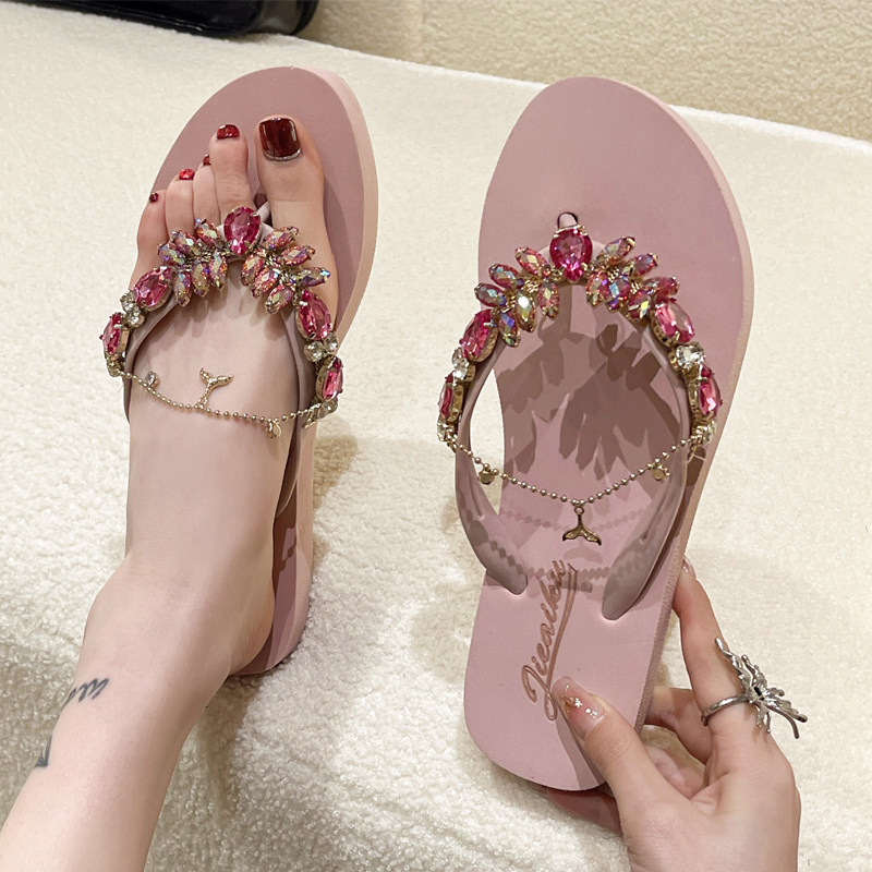 2023女夏新款水钻链条人字拖精致舒适平底防滑休闲沙滩度假风凉拖