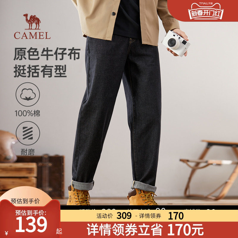 骆驼男装牛仔裤男2023新款春秋季黑色原牛耐磨宽松直筒休闲长裤子