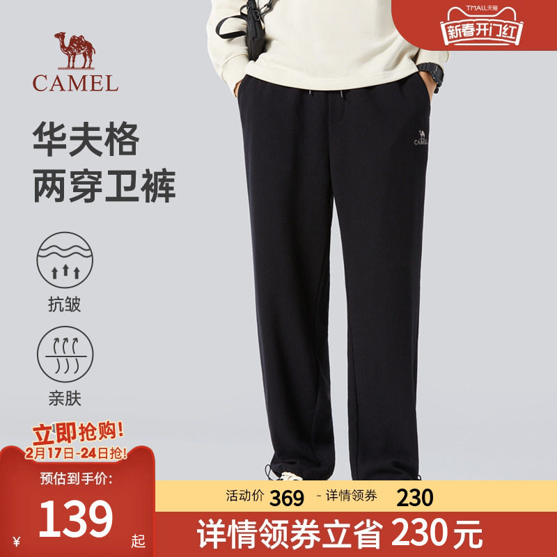 骆驼男装2024新款华夫格卫裤男女秋冬加绒直筒束脚两穿休闲长裤子