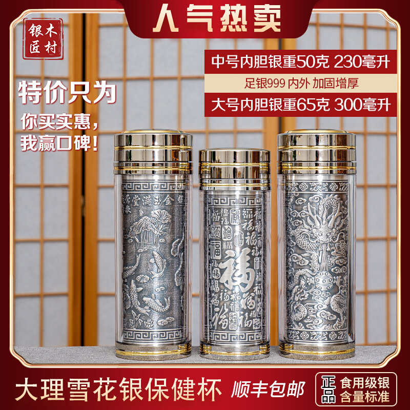银水杯999纯银保温杯九龙百福足银雪花银杯保健银杯子银内胆高档