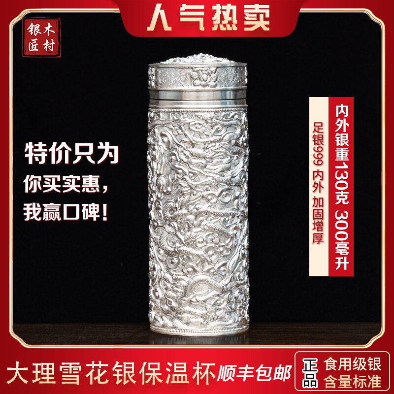 银杯子999纯银内胆水杯九龙银杯保温杯足银内胆雪花银保健银茶杯