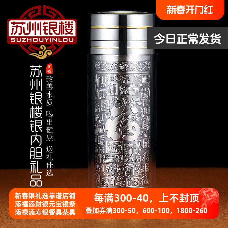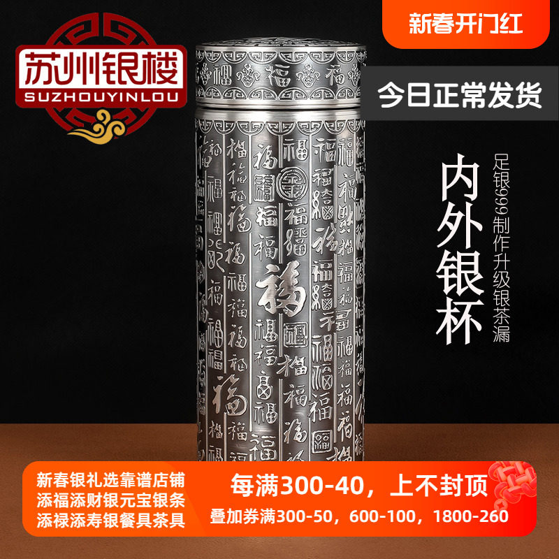 苏州银楼 百福银白复古999足银水杯保健内外办公杯银茶漏车载银杯
