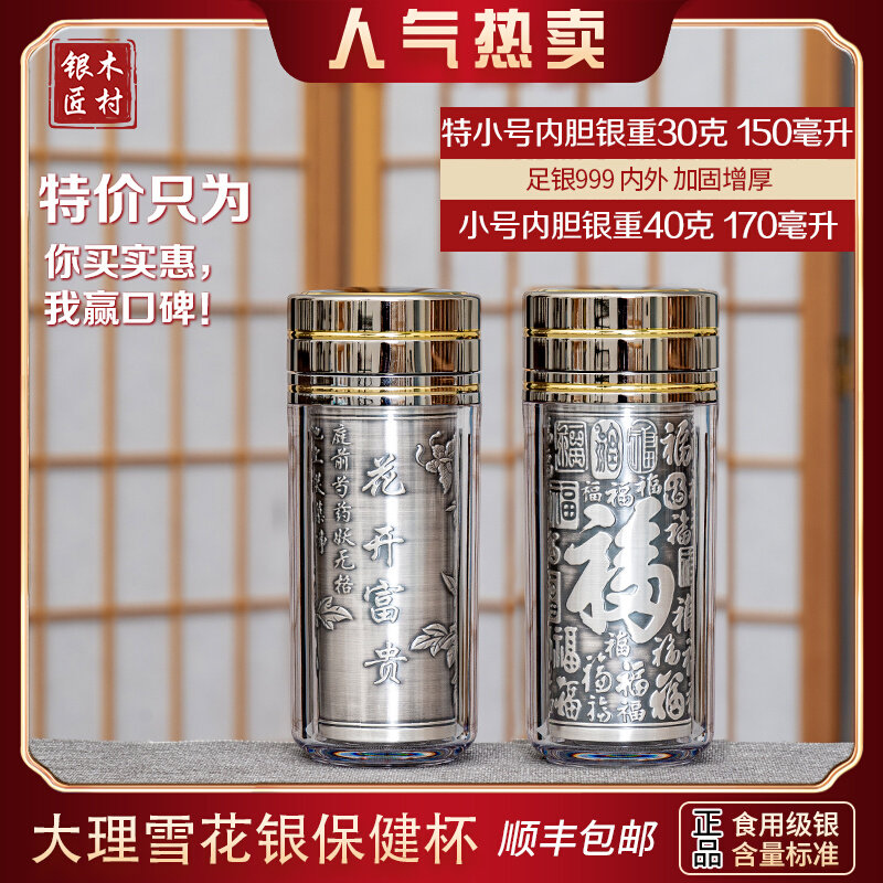 索肯银杯子999纯银内胆水杯保健杯茶杯保温杯雪花养生杯高档礼品