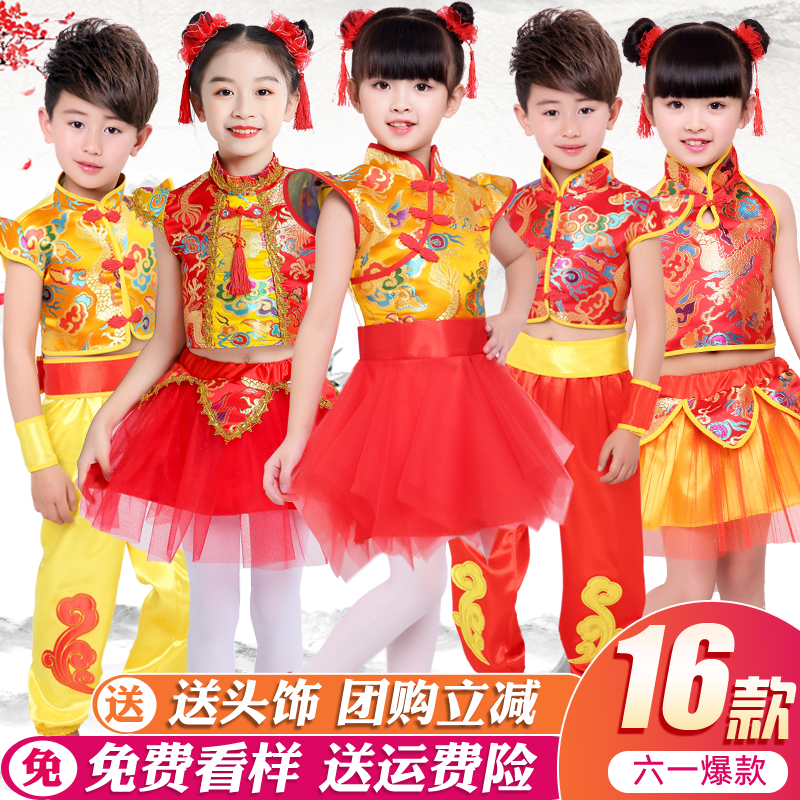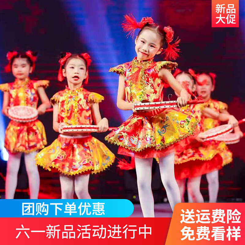 元旦儿童中国红说唱喜庆风梦娃秧歌服幼儿女太平鼓民族舞蹈演出服