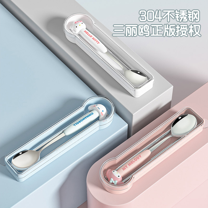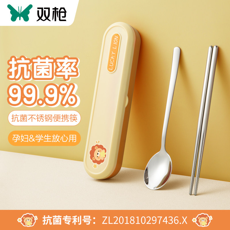 双枪304不锈钢抗菌筷子勺子套装DIY便携餐具三件套学生儿童收纳盒