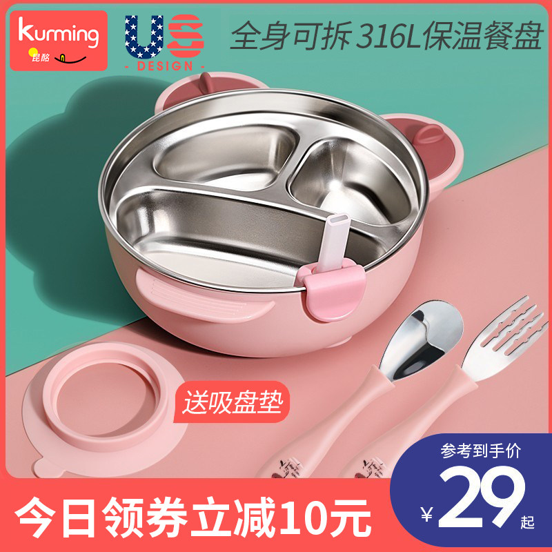 宝宝餐盘分格盘婴儿吸盘式316不锈钢吃饭碗注水保温儿童餐具套装