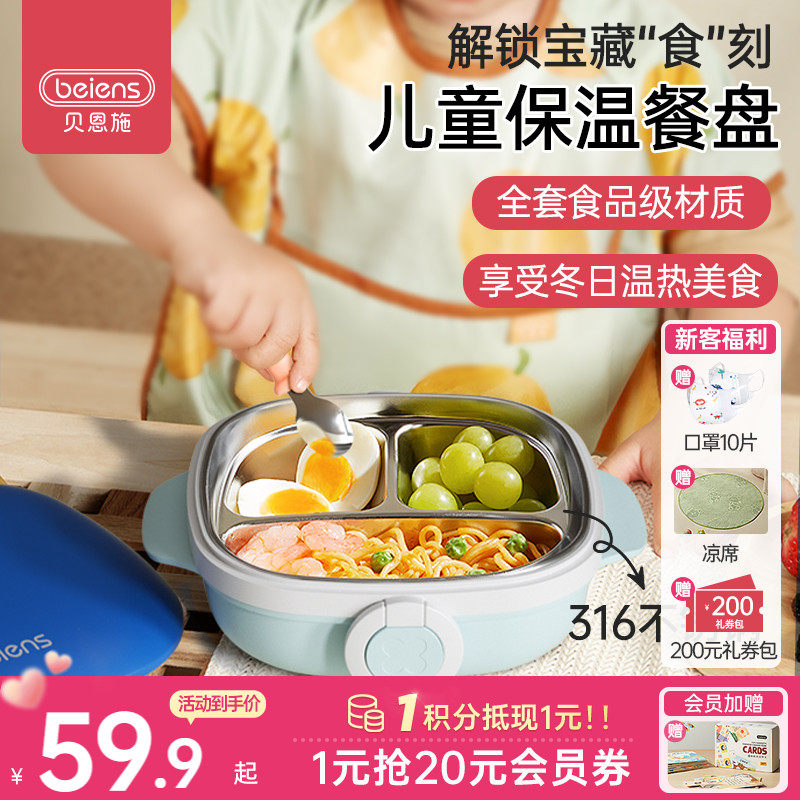 贝恩施宝宝餐盘婴儿辅食碗儿童专用吃饭餐具316不锈钢保温分格盘