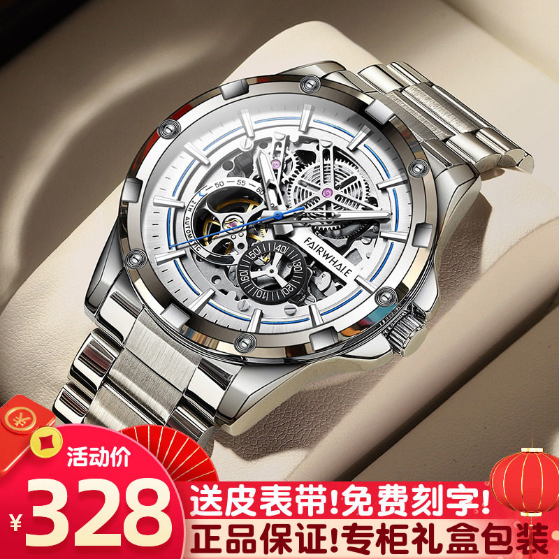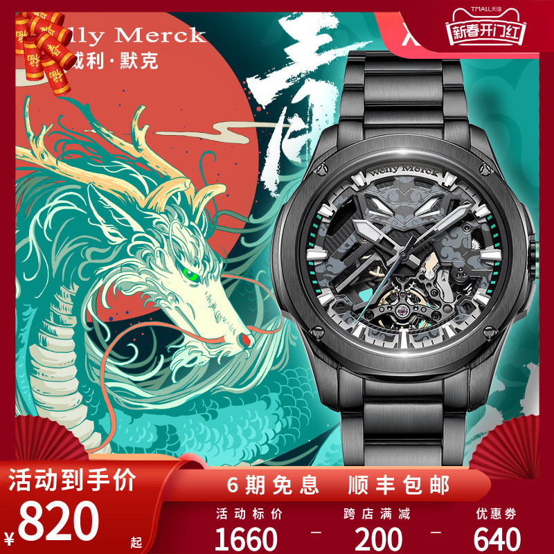 手表男全自动机械表镂空时尚潮流学生防水虫洞氚气个性小众腕表潮