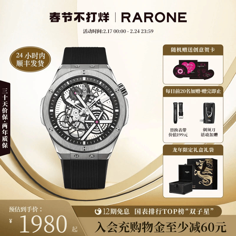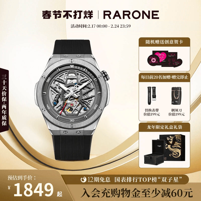 Rarone雷诺双子星镂空机械表男全自动国产腕表经典原创设计送男友