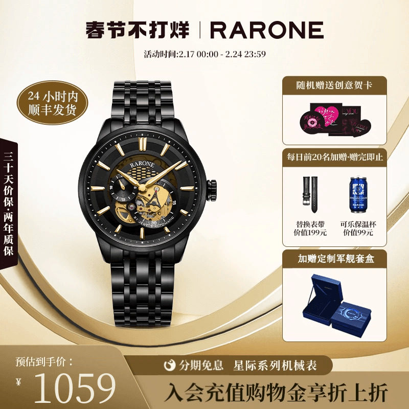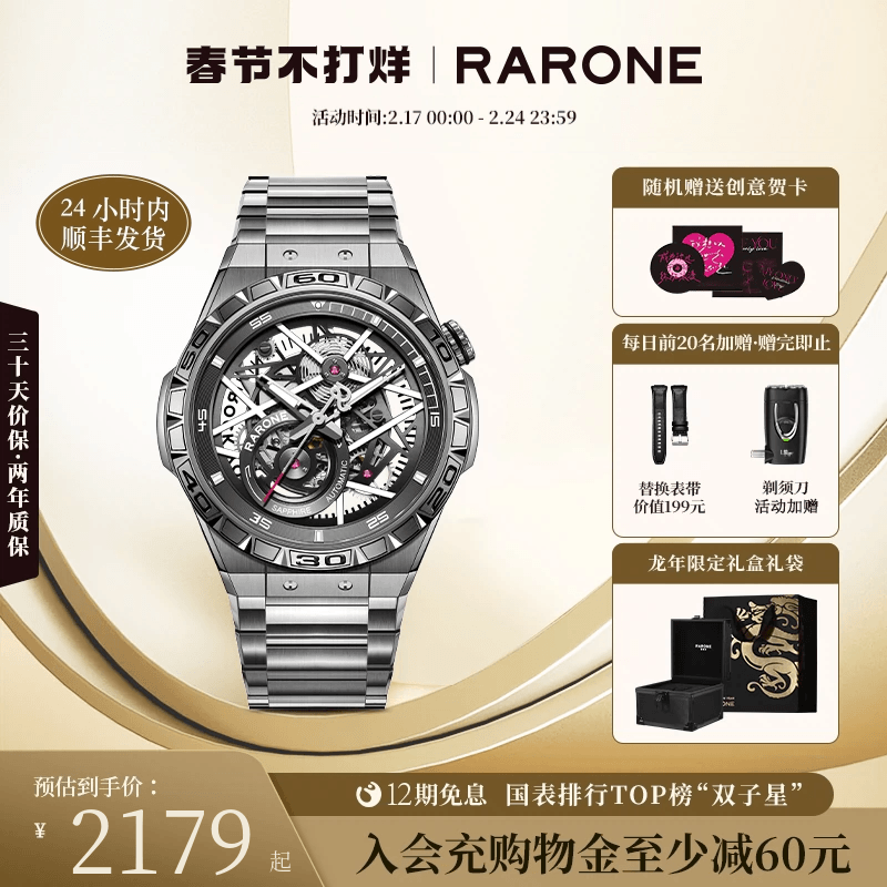 Rarone雷诺双子星系列Y镂空全自动夜光机械表防水手表男钢带送礼