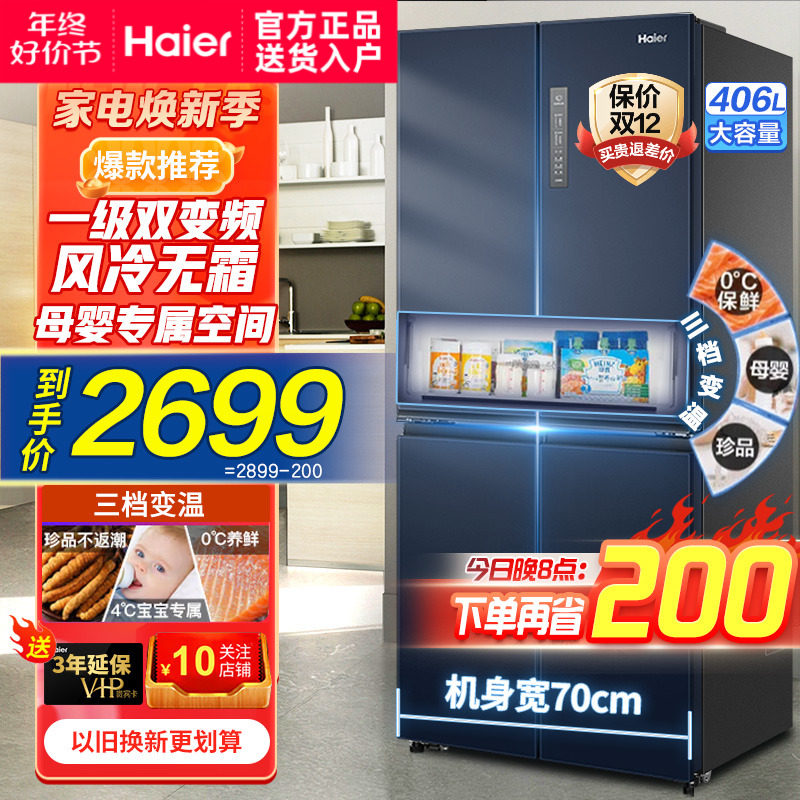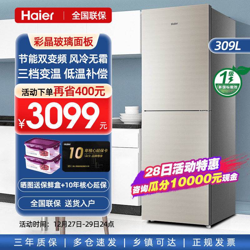海尔电冰箱309升彩晶玻璃面板一级能效变频风冷无霜两门家用官方