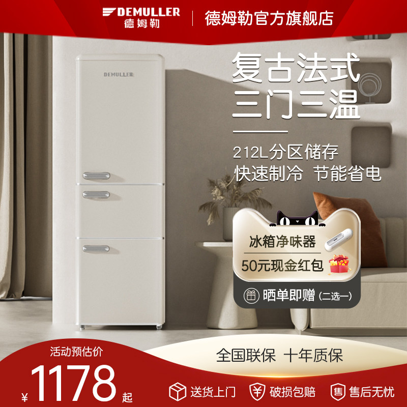 德姆勒复古冰箱三门大容量网红小型家用冰箱冷藏冷冻租房静音节能