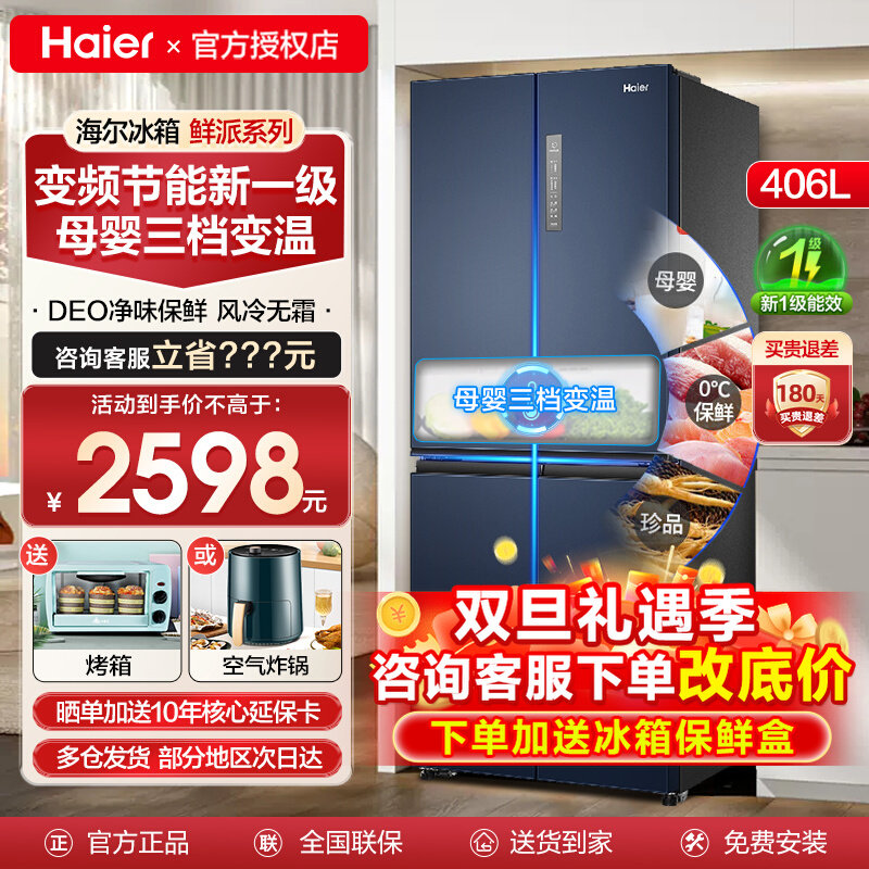 [零嵌入式]海尔电冰箱统帅461L十字四门家用一级能效超薄底部散热