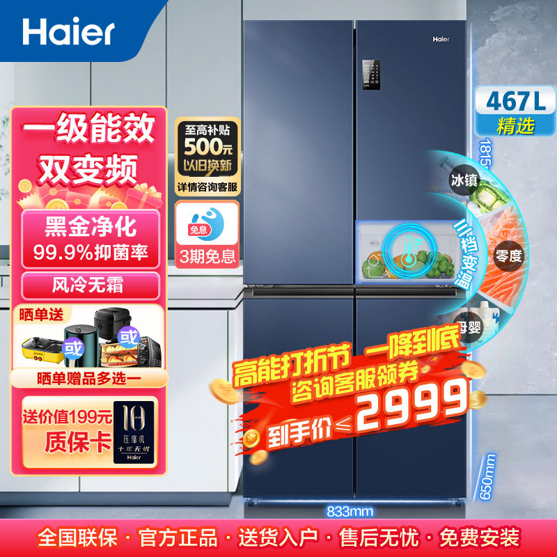 海尔电冰箱一级能效家用467L大容量十字门嵌入式变频风冷无霜正品
