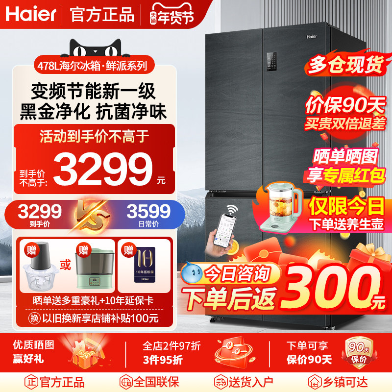 海尔统帅478L升四门冰箱一级能效变频十字双开家用节能官方对开门
