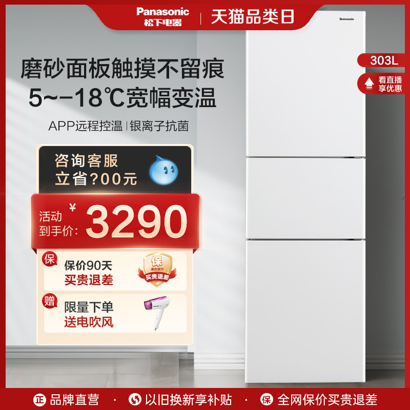 松下303升三开门家用冰箱风冷无霜变频大容量智能节能EC30AP1-W