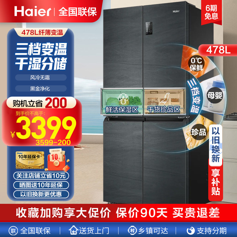 海尔冰箱501升/478L十字对开四门家用风冷无霜变频一级节能超薄款