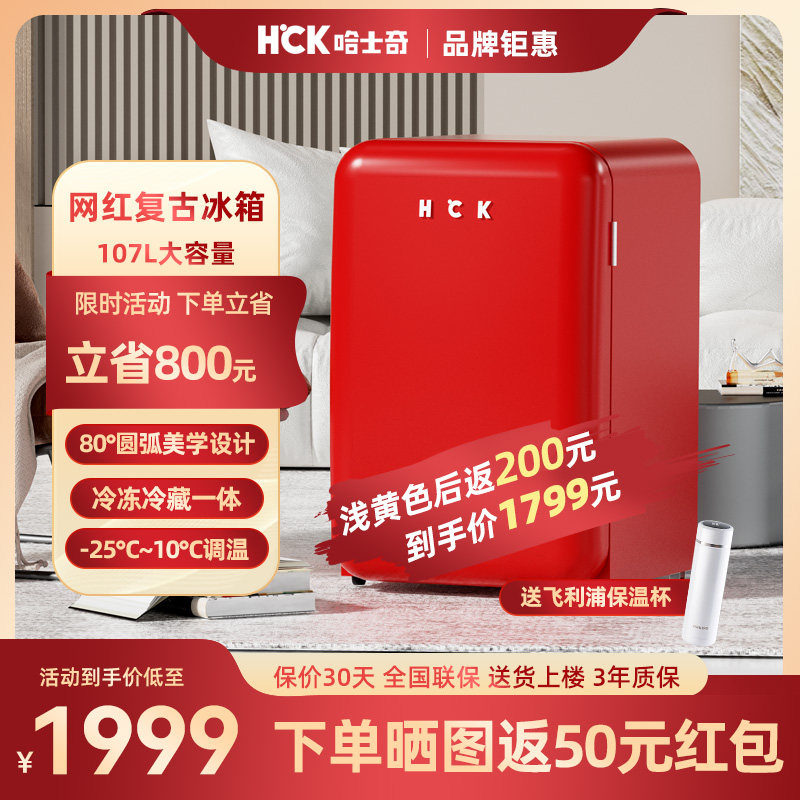 HCK哈士奇复古冰箱网红高颜值家用客厅美式彩色单门奶油迷你小型