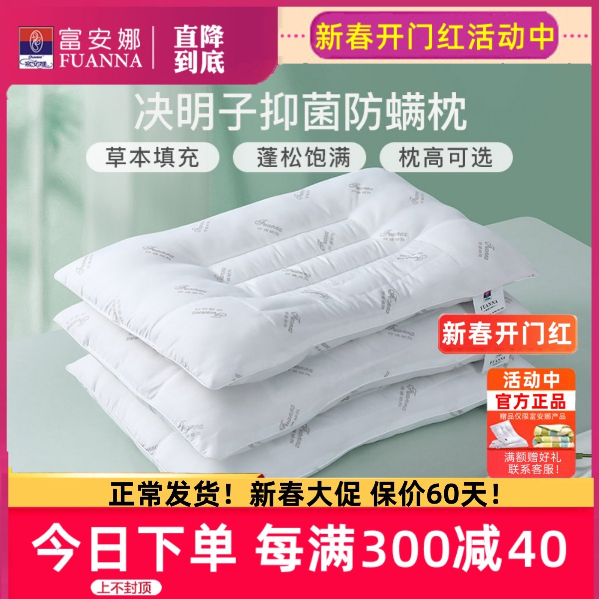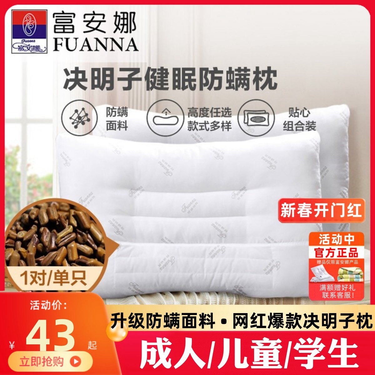 富安娜决明子枕头 抗菌防螨家用护颈椎 成人学生睡眠专用单人枕芯