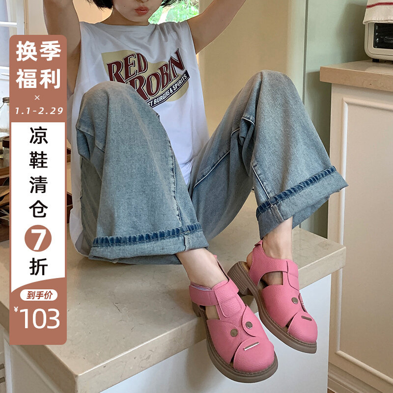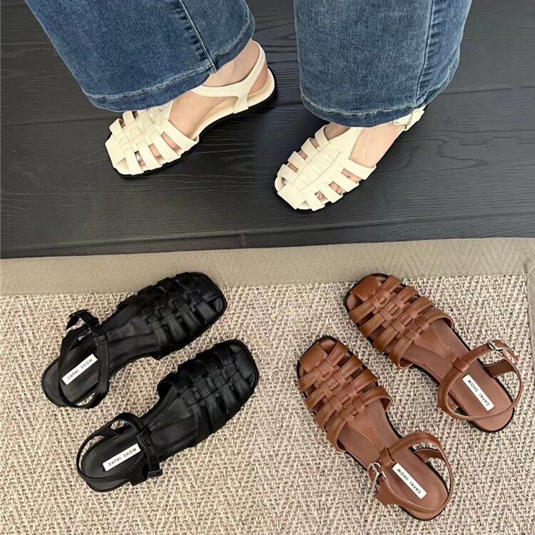 喵唔的天空2024春夏软底复古编织罗马鞋包头学院风百搭镂空凉鞋女