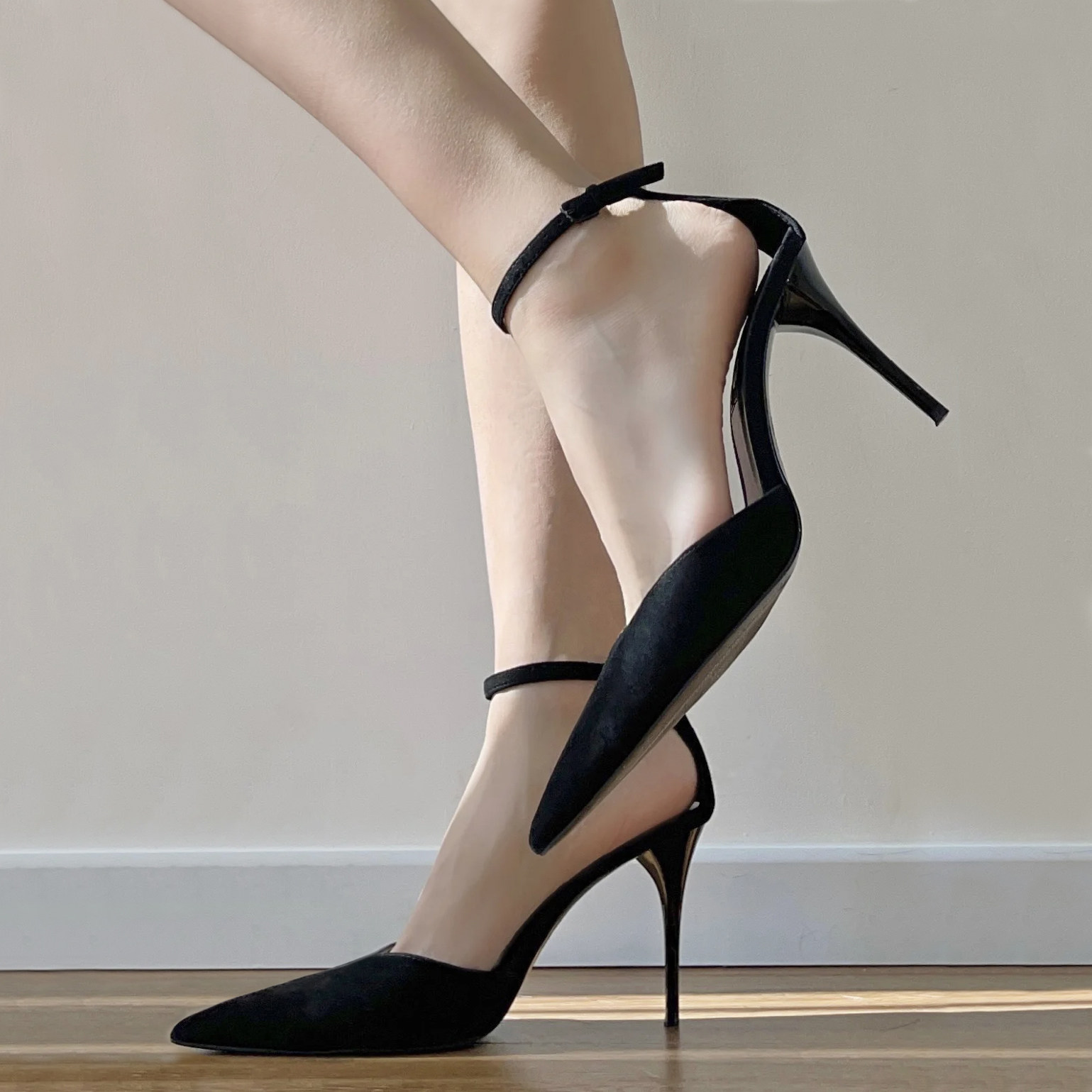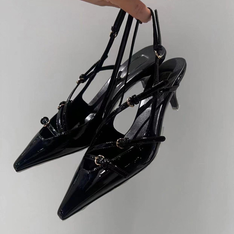 HLTINO2024春季新款黑色尖头高跟鞋一字带亮片漆皮包头凉鞋女细跟