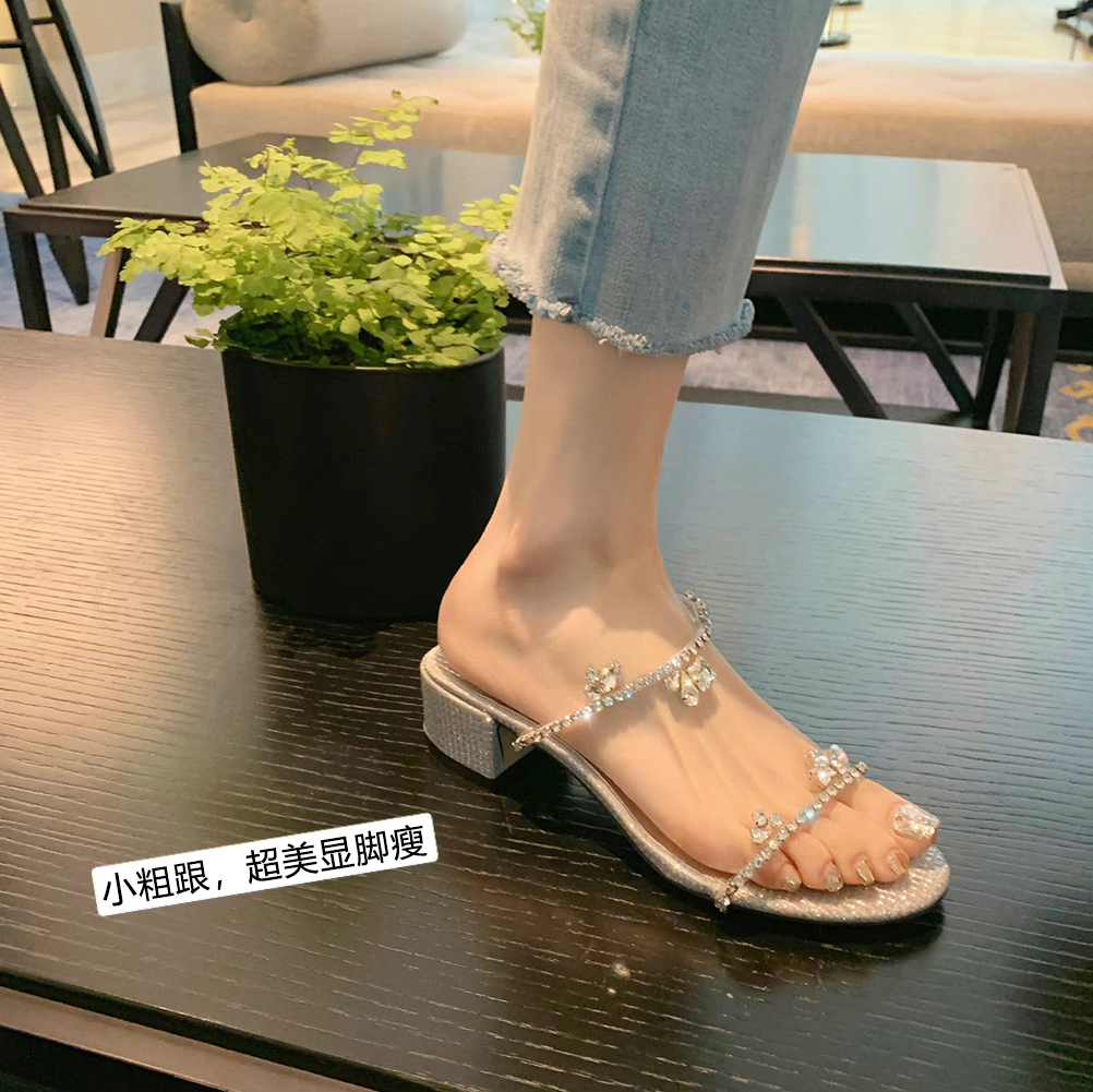 粗跟凉拖鞋女夏外穿2023年新款法式水钻中跟一字带凉鞋水晶高跟鞋