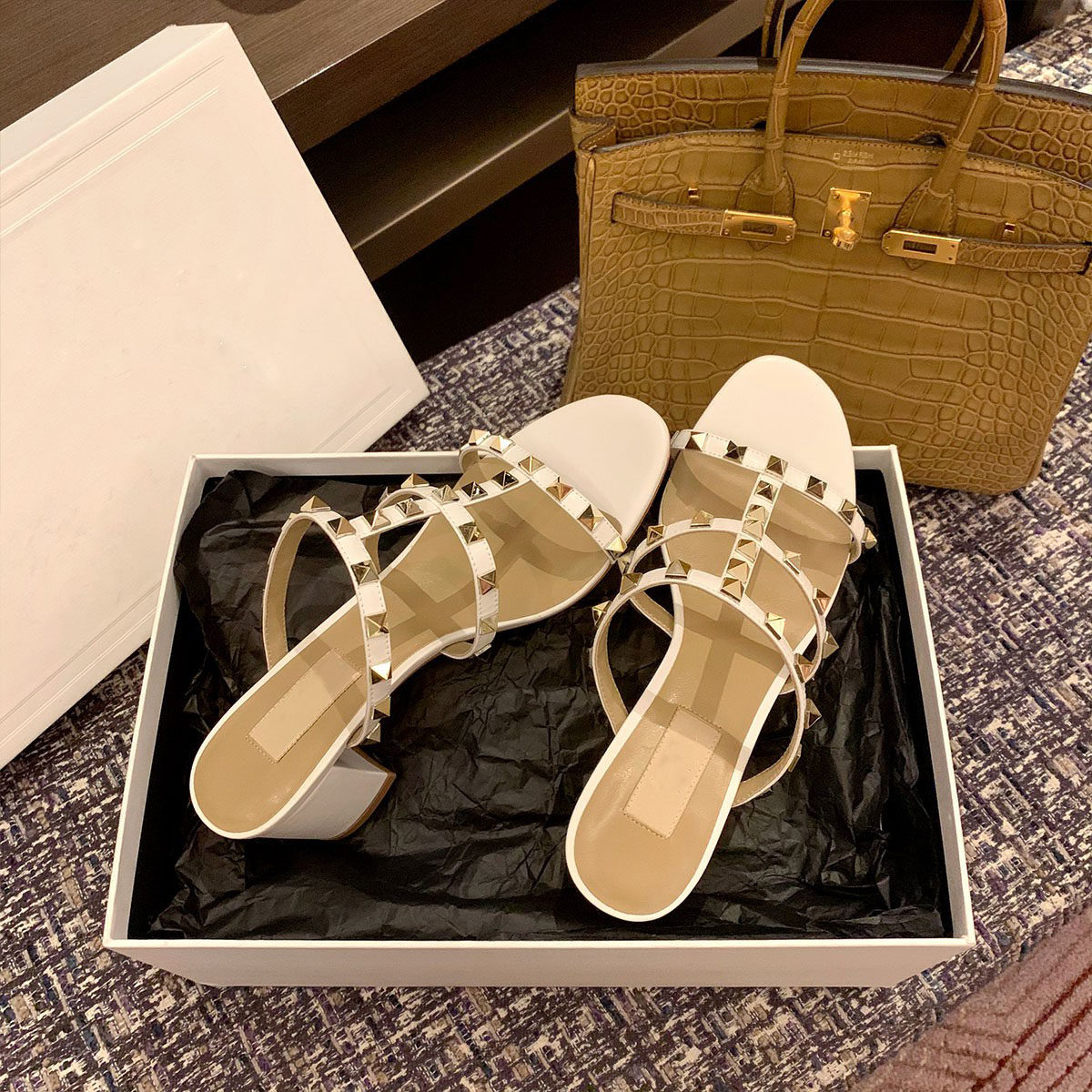 法式夏季凉鞋女2024新款真皮外穿凉拖鞋女铆钉粗跟百搭时尚高跟鞋
